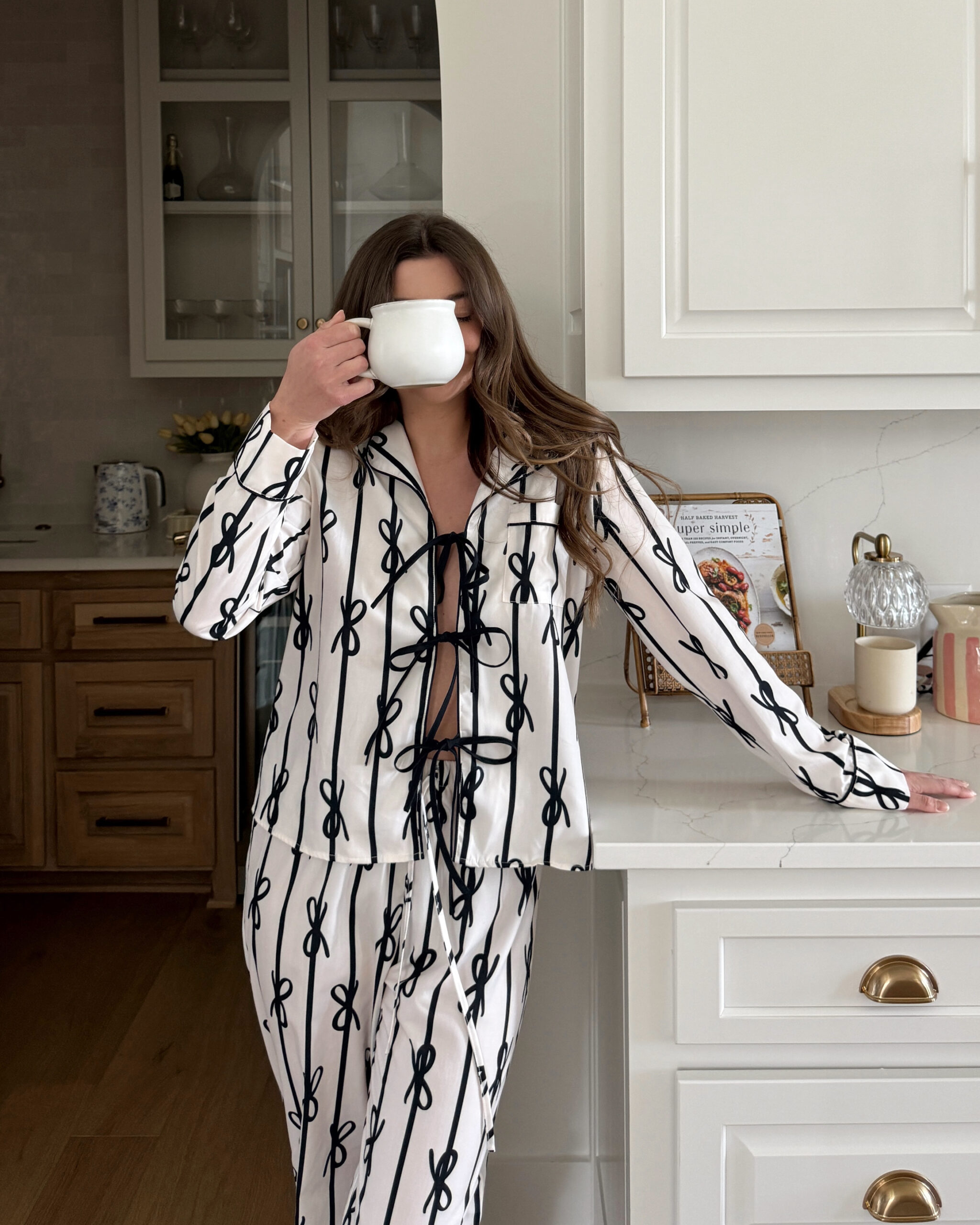 Enter: these cute black and white bow pjs! These pajamas are long sleeve, cute, lightweight, and seriously flattering. The tie-down top is so chic and would be great for breastfeeding moms!
