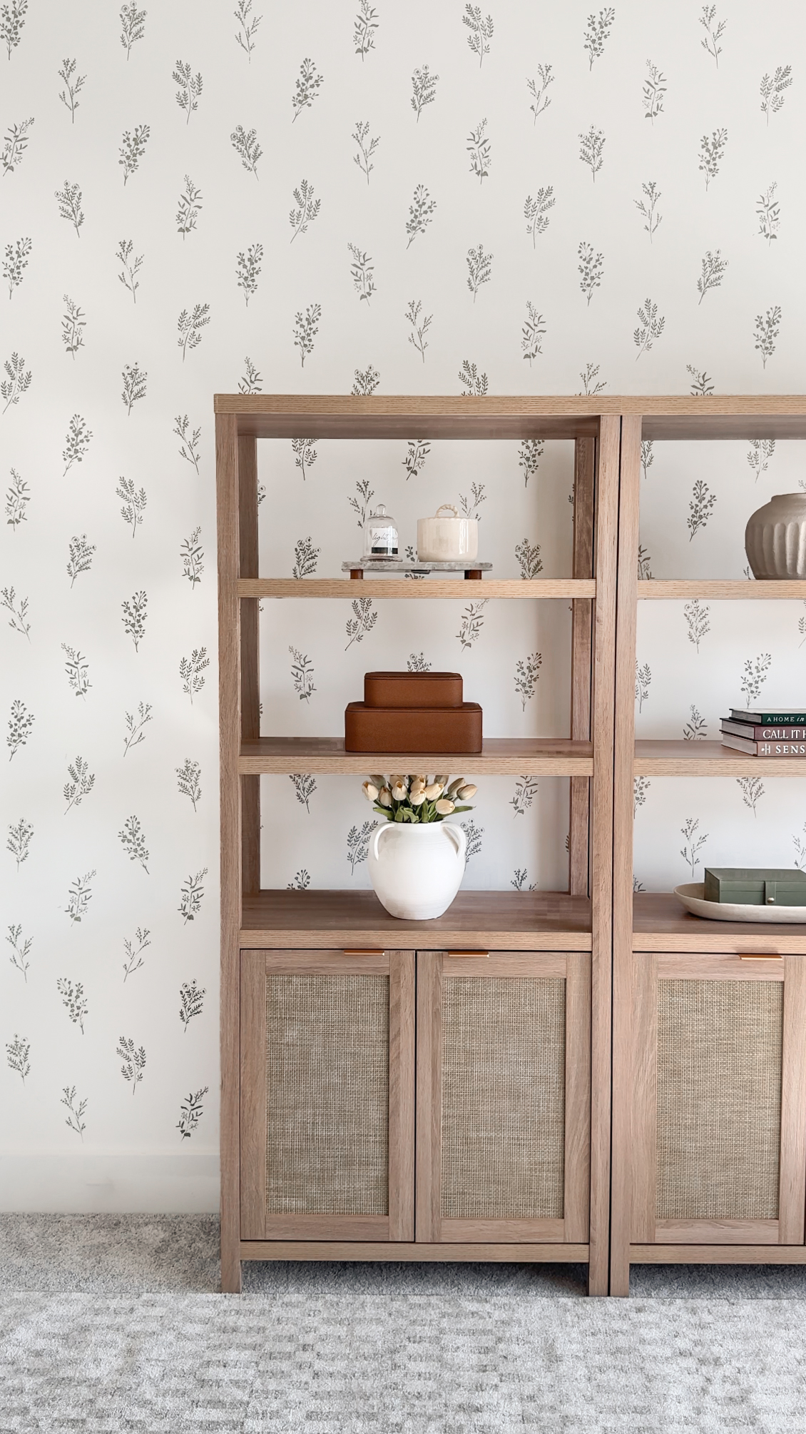 Bookshelves: I am so in love with these neutral ratan bookshelves! These were gifted from a brand on Amazon. I styled them with a mix of books, vases, and decorative pieces.